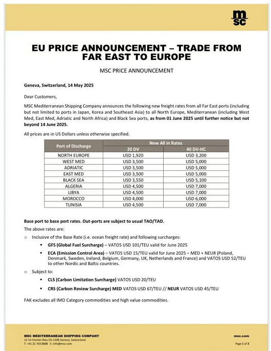 据获悉:上周三(5月14日),全球最大集装箱运输公司MSC宣布:自2025年6月1日起,所有远东港口(包括但不限于日本、韩国和东南亚的港口)至所有北欧、地中海(包括西地中海、东地中海、亚得里亚海和北非)和黑海港口的新运费如下,有效值至2025年6日14日。