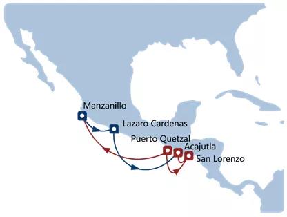中远海运自营投船航线。实现危地马拉、萨尔瓦多、洪都拉斯、尼加拉瓜、哥斯达黎加太平洋侧港口与墨西哥之间的快速服务,通过墨西哥与亚洲、南美洲无缝衔接。同时提供各国家主要城市到门运输服务。