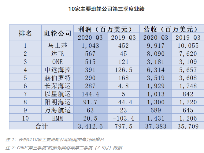 10家班轮公司在第三季度全部实现盈利,利润总额达到34.12亿美元,去年同期为不到8亿美元,是去年同期的4.27倍。