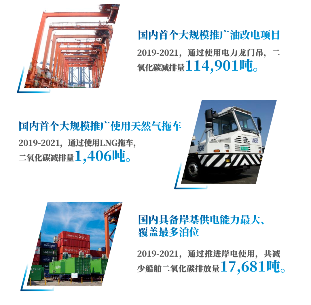 世界级码头在绿色理念上也是时刻贯彻践行。推进岸基船舶供电、龙门吊“油改电”、液化天然气(LNG)拖车应用是最主要、贡献最大的三大举措。其中,盐田国际的岸基船舶供电作为全国最早使用、覆盖泊位最多和供电能力最大的港口,双碳节能效能达到世界领先水平。