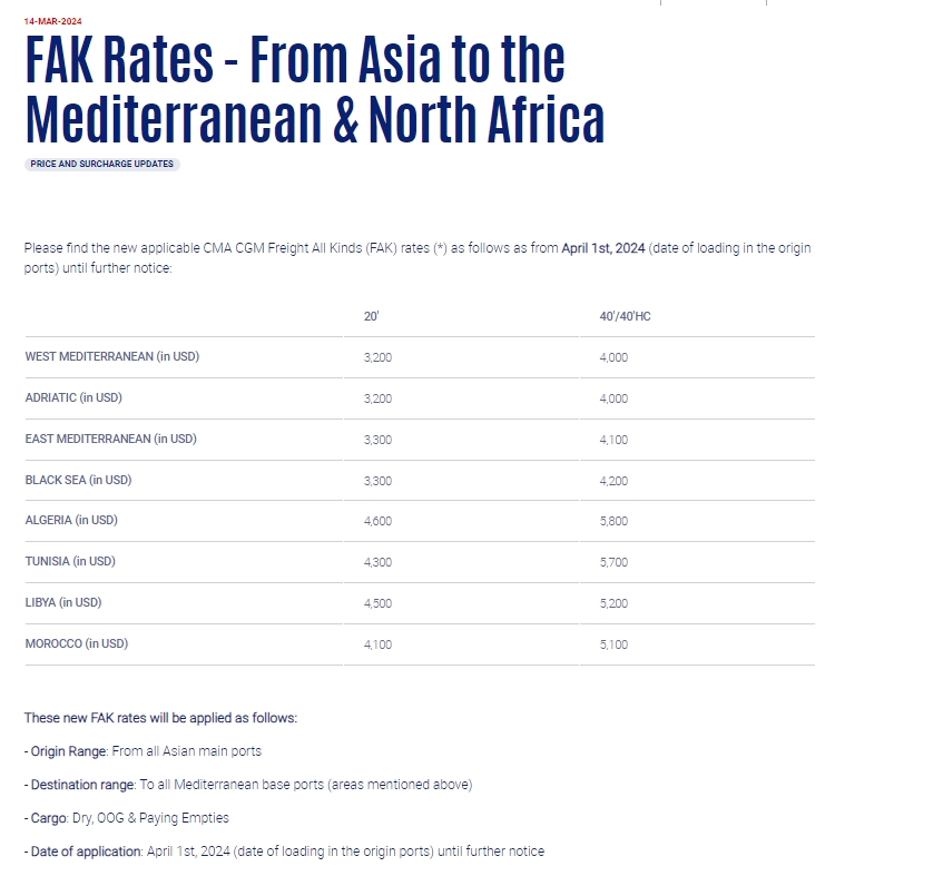 3月14日,达飞发布最新公告,自2024年4月1日(装货日期)起,从亚洲到地中海和北非征收新的FAK费率,直至另行通知。详情如下: